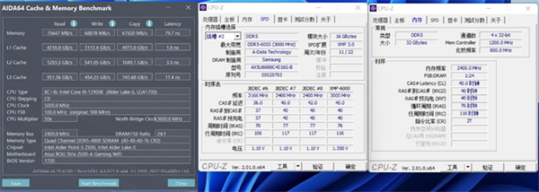 这是在BIOS全默认的情况下测得的数据,此时内存频率为4800MHz,时序为40-40-40-76 CR2.内存的读取、写入和复制带宽分别为:75647MB/s、68878MB/S、67920MB/s。而内存的延迟则为80.7ns。