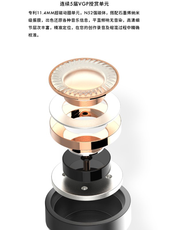 塞子内部来说,它采用的11.4MM超磁特斯拉动圈单元,N52强磁体,搭配石墨烯纳米级振膜,拥有双磁路二分频技术,该品牌钻研许久的双腔体技术,在驱动单元背面设置有声学导孔,合理控制导孔能优化振膜运动。且拥有独立的超高频分频技术,保证了优良的超高频还原,频宽则达到了夸张的20~40KHz。