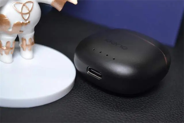 Type-C的充电接口,4盏LED点亮指示灯,用来展示电池续航余量。内置280毫安时的电池容量可以提供耳机4次的充电循环。