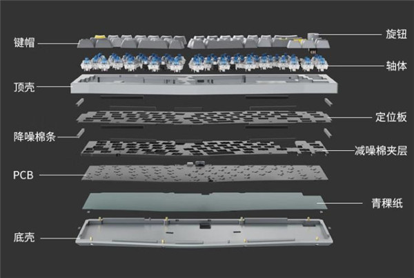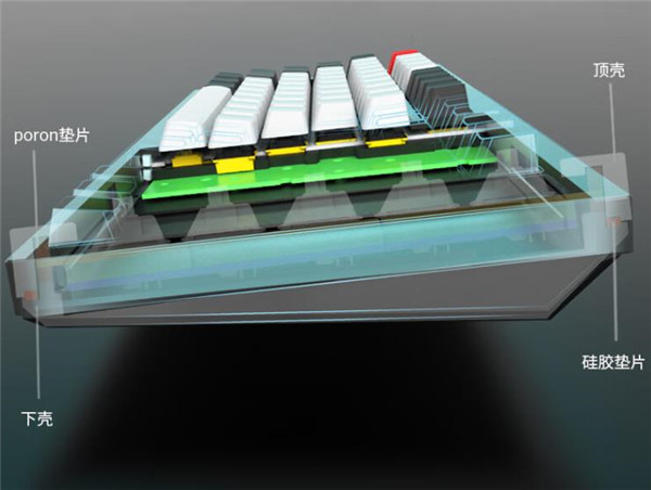 双垫片设计是业内一种新的创新结构。除了板上的垫圈外,我们还在顶部和底部外壳之间添加了硅胶垫,以显着降低金属之间的声音共振,并降低受影响金属的噪音。这种设计使键盘能够保持垫片结构的灵活性,并改善整体打字声音。
