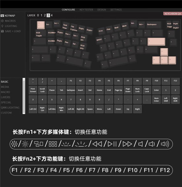 按键背光部分,Keychron Q8 相对比较克制,提供了全彩 RGB 以及多种灯效。用户可以使用快捷键调用自带的多种灯效模式,也可以在 VIA 内手动修改和调节。