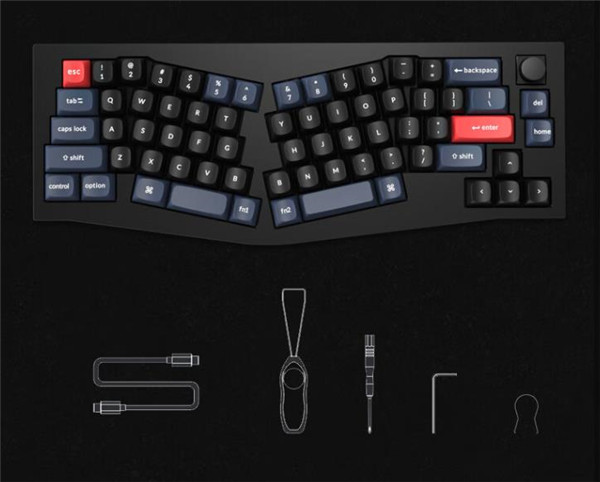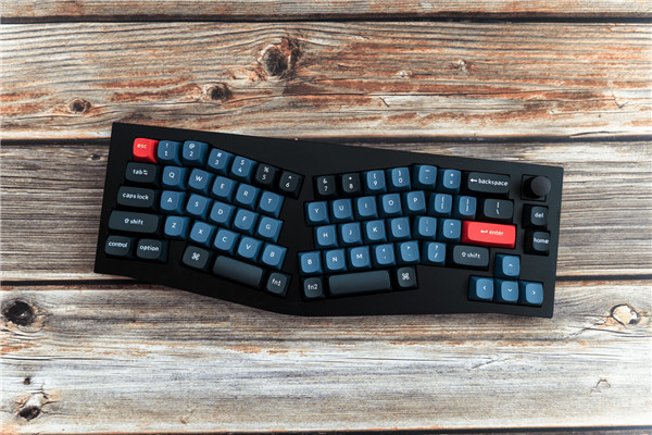 默认键帽采用了红+蓝灰+黑三色设计,作为客制化键盘,大家还是可以自由的 DIY。Alice 布局其实也是比较经典的左右分割设计,左右手各自负责键盘一半的区域,默认左右区域各放置了1颗 B 键,这部分可以根据使用习惯自行替换/设定为其他按键。
