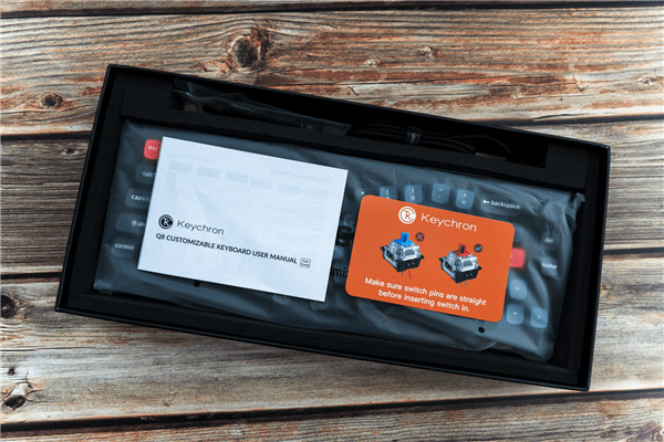 在包装方面,Keychron 采用了简洁的黑色,正面印刷了系列的标准布局,根据不同用户需求提供了旋钮和普通版本可供选择。打开包装盒可以看到用户手册以及提醒插拔轴体注意针脚垂直的提示,附件部分自带一根编织 USB Type-C to USB Type-C/A 线,脚贴、Win 键帽 、螺丝刀、六角、拔键器以及拔轴器,基本可以满足用户拆装需求了。外包装还附带了额外的一张减噪棉夹层。