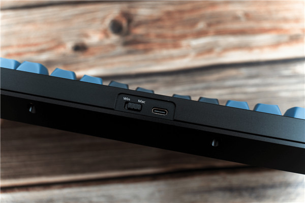 从 Keychron Q8 侧面视角来看,不同排按钮高度渐变,键帽也根据位置进行了倾角调整。键盘顶部除了 USB Type-C 接口外,还有 Win 与 Mac 布局切换按钮。