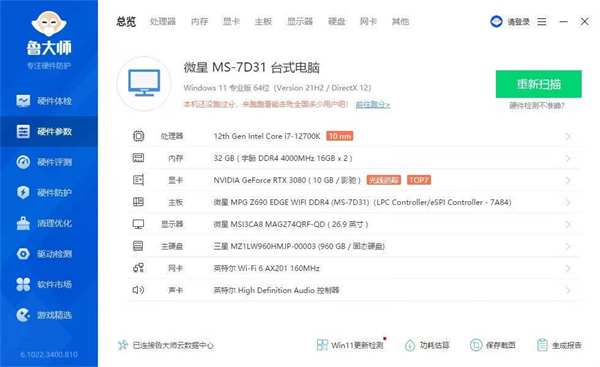 ▼整机配置一览,处理器是12700K,主板是微星的Z690刀锋EDGE,显卡是影驰的RTX3080 10G HOF PRO。