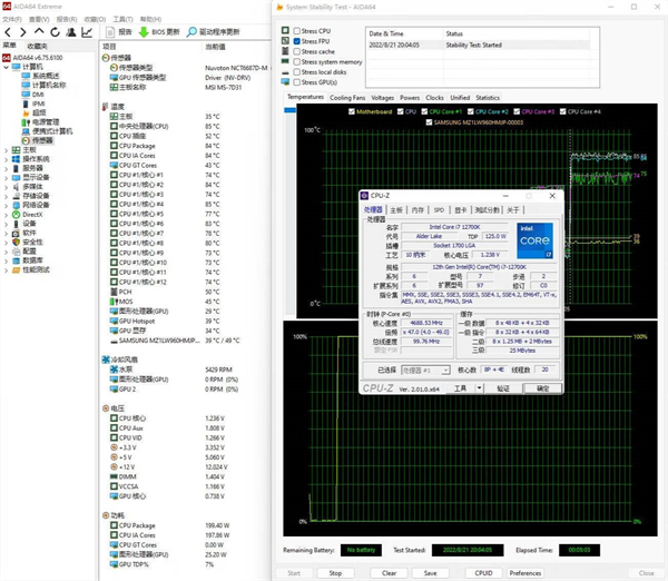 ▼单烤FPU测试,处理器功耗200W左右,大核心睿频4.7GHz,处理器的温度在85℃左右,核心温度在80℃左右波动,整体散热情况良好。