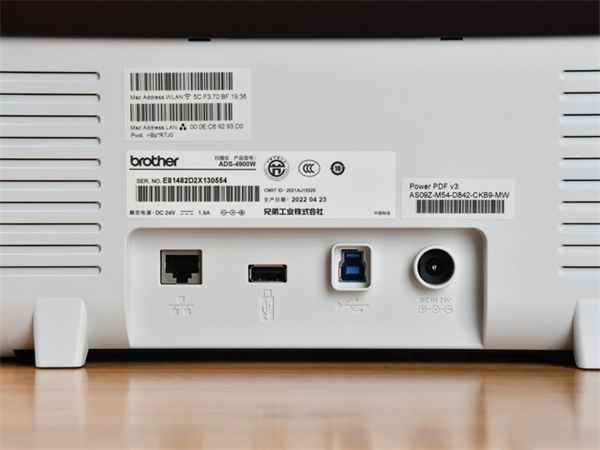 最后我们来看接口部分,这款兄弟ADS-4900W扫描仪为用户提供了非常丰富的接口设计,其中就搭载了电源接口、USB接口以及网络接口。值得一提的是这款扫描仪支持有线和Wi-Fi两种网络模式,可快速在无线网络中实现局域网内的共享扫描,同时还能够通过Wi-Fi将扫描的文件直接传输到笔记本、平板或者手机等移动设备,让办公的效率大大提升。