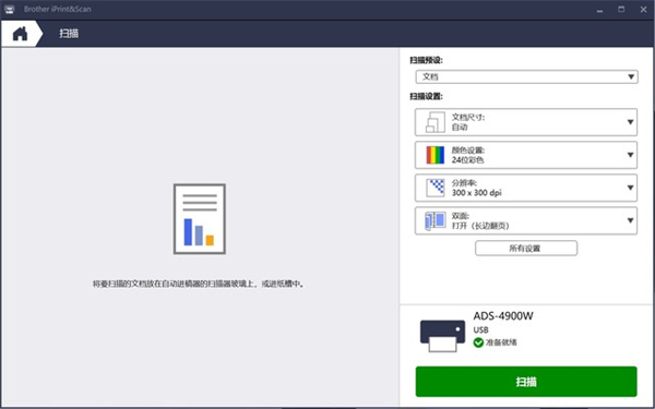 为了能够让扫描文件更加便捷同时更加高效,兄弟ADS-4900W扫描仪为用户搭载了iPrint&Scan扫描软件。从软件的主界面我们不难看出,整体的页面布局十分简约,能够让用户快速上手。其中最主要的扫描设置分布在界面的最右侧,可以对颜色、分辨率以及双面扫描等参数进行设置,可以说非常人性化。
