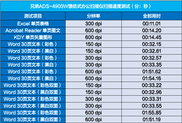 众所周知,对于一款馈纸式扫描仪设备而言,扫描速度是至关重要的参数。下面我们就正式开始对兄弟ADS-4900W进行扫描速度的测试。我们将针对不同的分辨率以及色彩模式展开测试,需要说明的是,整个测试过程我们采用PC端USB连接的方式进行测试,这样可以最大程度减少因网络延迟因素造成的误差,详细测试结果如下: