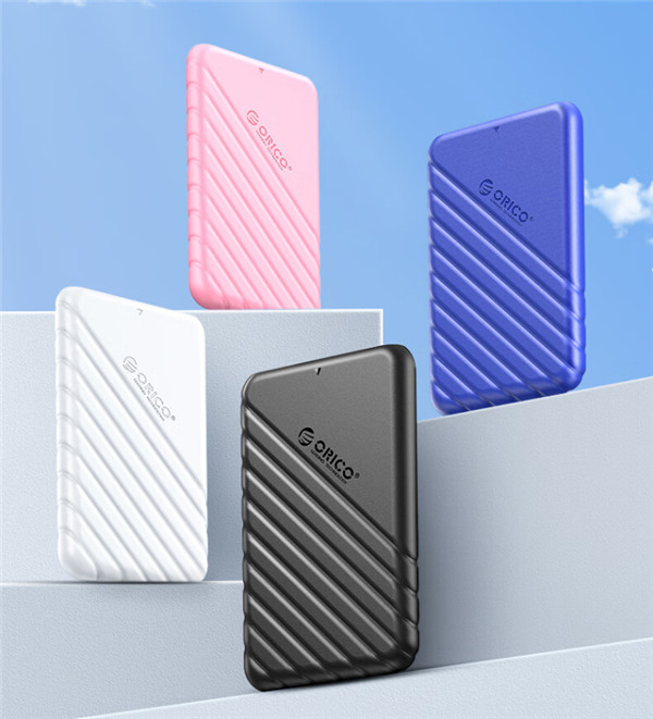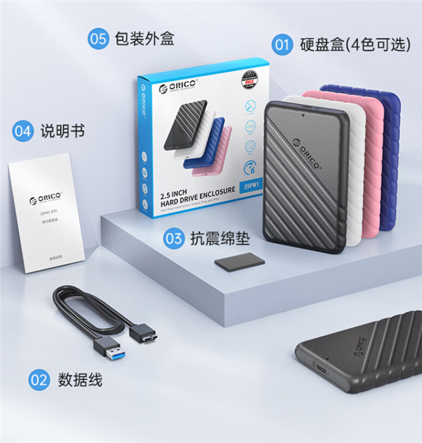 奥睿科移动硬盘盒25PW1外包装是白底蓝边的方形包装盒,正面有产品图片、品牌Logo,诸多信息看的还是比较清楚明了的。一共黑、白、蓝、粉四款个性配色,可随心选择。