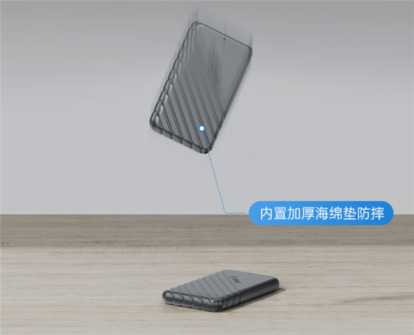 打开奥睿科移动硬盘盒25PW1,可以看到里面还内置了加厚棉垫,这可以有效缓解碰撞冲击力,抗震防摔,多重保护让硬盘在使用过程中更安全。