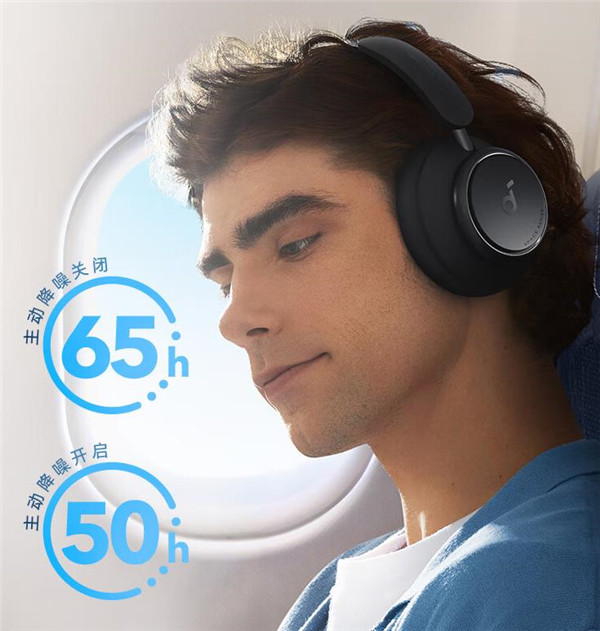 续航方面,关闭主动降噪的情况下,该耳机可提供65小时续航,开启主动降噪时,可提供50小时续航。同时,官方声称该耳机充电5分钟,可使用4个小时。
