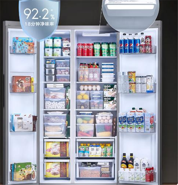 在日常生活中,无论是健忘也好,存储不当也罢,冰箱异味可以说是一个无法完全避免的问题,而冰箱本身就是一个密闭空间,一旦产生异味,想要彻底清除并不容易。云米BCD-640WMLAD03搭载了主动净味系统,还将AI技术引入到了净味系统当中,打造出的AI智目净味系统,全时段自动识别冰箱内腐烂食物或味道较重的食材产生的硫化氢、三甲胺等带有刺激性味道的气体。并且通过云米AI冰箱特有的大屏幕以及手机APP实时显示冰箱内的洁净指数,反映食材的新鲜度,让冰箱异味可视化,再采取“一键净味”模式,以最快速度净化空气,能在18分钟内快速净味。