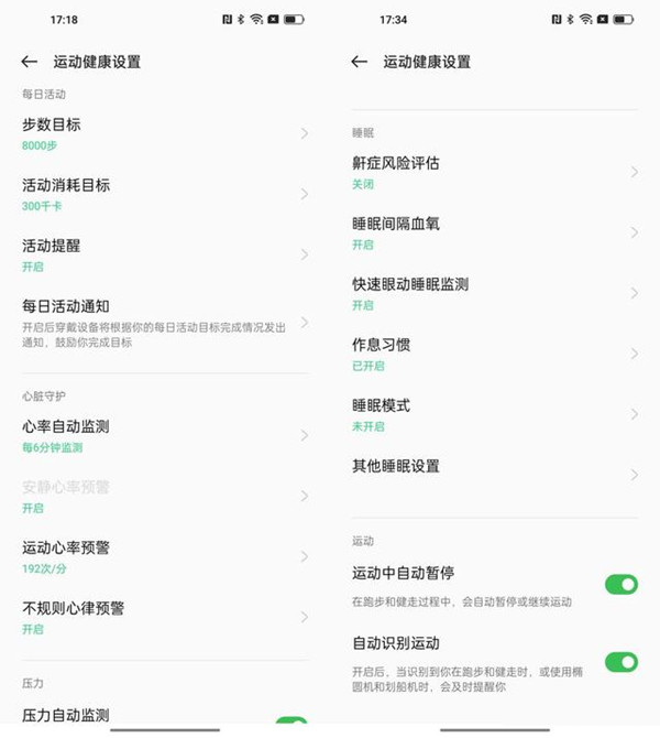 在【运动健康设置】选项中,可以设置每天步数目标和活动小号目标。除此之外,也可以设置睡眠中的一些检测,包括鼾症风险评估、睡眠间隔血氧、快速眼动睡眠检测、作息习惯等,相对而言功能已经很全面了。就单论检测功能,不到三百元的OPPO 手环 2就已经可以跟Apple Watch S6/7等几千元的设备比了。