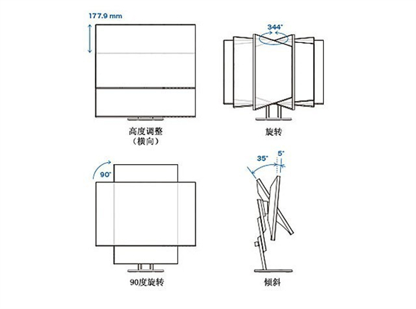 艺卓EV2785等显示器普遍支持屏幕的上下调节、屏幕的90度旋转竖屏以及屏幕的俯仰调节,角度如上图所示。并且底座方面也采用了多功能底座的设计,支持显示器水平旋转。这样在我们日常办公过程中,高度调节和俯仰角度调节可以满足坐姿、站姿的办公切换,减少久坐对身体的伤害。同时在分享和会议使用的时候,旋转和竖屏操作更方便讨论和同时观看显示器。当然IPS面板提供的178°可视角度也在这里发挥了巨大作用。