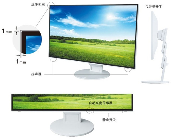 艺卓EV2785、EV2760、EV2360等显示器都有一个特性,就是窄边框设计,这样我们可以更加关注屏幕显示内容本身,而不会被厚重的边框影响。像是艺卓EV2785显示器的两侧以及顶部边框的厚度仅有1mm,近乎无边框设计。如果是多台显示器拼接显示,可以做到几乎无缝连接。