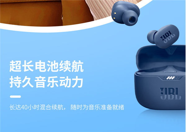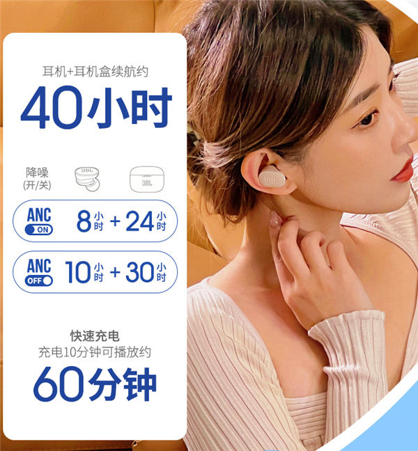 在续航表现方面,JBL TUNE130NC真无线蓝牙耳机内置锂离子聚合物,耳机+耳机盒的续航时间可达到40小时。按照每天使用三小时来计算,大约两周才需要充一次电。且支持快速充电,充电十分钟即可播放60分钟。