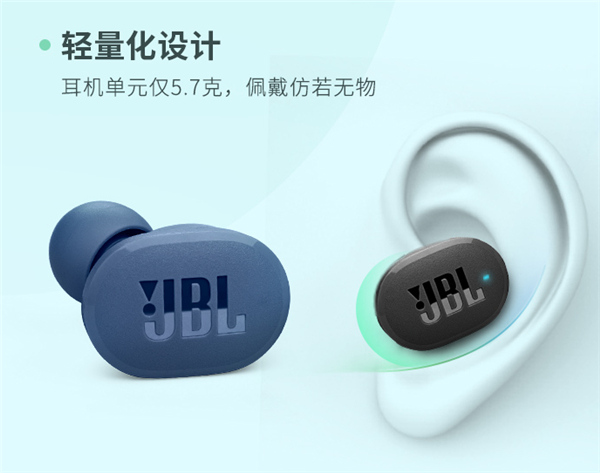 JBL TUNE130NC真无线蓝牙耳机采用人体工学设计,佩戴舒适贴耳,并且精选轻量化材质打造,单只耳机仅重5.7g,佩戴起来毫无压力,即使长时间佩戴也不会感到疲劳。