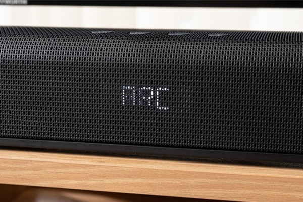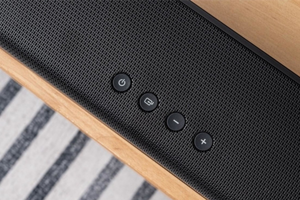 在回音壁的正面还带有Nakamichi中道的品牌logo以及杜比全景声的logo,与此同时正面还有LED灯显示屏,能够显示目前回音壁的输入源等信息,方便快速了解音箱工作状态。顶部则有着四个实体按键,负责开关机,信号切换以及音量加减。