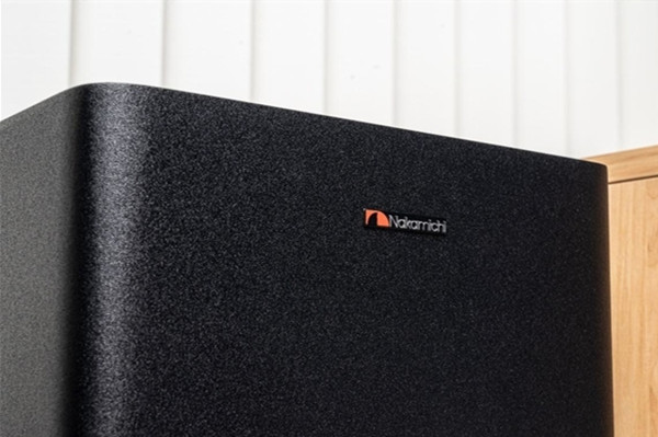 低音炮部分呢同样采用了圆边倒角的圆润设计,整体采用的是磨砂材质,在不同灯光角度下,展现出不错的质感,箱体上同样点缀有Nakamichi中道的logo。