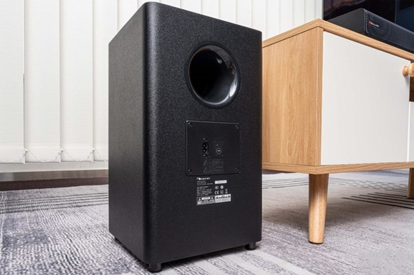 低音炮的背面箱体后背设计了倒相孔,能够有效促进气流的流动,以进一步提升低音质量。值得一提的是,低音炮的单元被设置为向下发声,这样的设计理论上能够让我们更好的感知到低音的效果。
