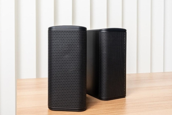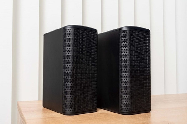 这对小卫星箱能也是保持着圆润的造型,正面也是用上了和回音壁本体一样的大面积金属网罩,两边则则是采用了哑光材质的材料,质感同样出色。