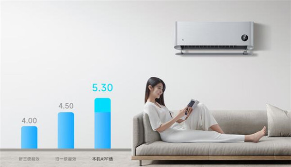 米家空调自然风1.5匹采用全直流变频一级能效,APF 5.30,对比老一级能效,全年可省电112度电,对比新三级能效,全年可省205度电。