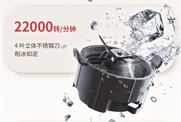 4叶立体不锈钢刀,高速纯铜电机,22000转/分,削冰如泥,新鲜的果蔬汁、香浓的思慕雪、轻食代餐都是手到擒来。