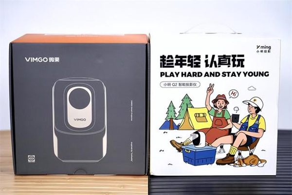 包装盒风格迥异,微果C1为低调沉稳的黑色配以金色勾勒出产品线条,彰显品质感;小明Q2则主打年轻时尚元素,简单的插画提醒用户除了居家场景外,还能搭配移动电源在野外露营环境使用。