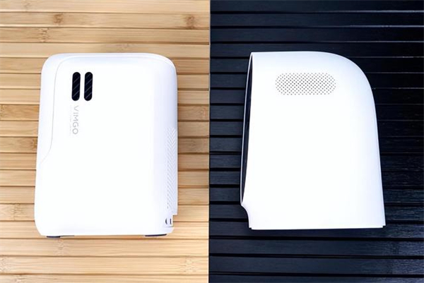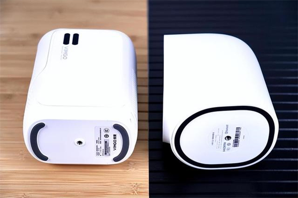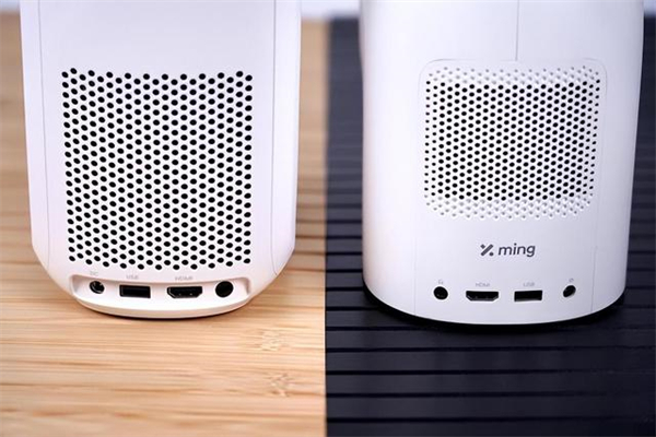 微果C1与小明Q2不约而同的采用立放设计,造型仿佛小黄人,节约摆放空间。小明Q2机身重量比微果C1轻了2斤左右,配合自动对焦、梯形校正功能,甚至随用随拿毫不费力。主观来看,小明Q2的椭圆形工业美感更胜一筹,微果C1拼接痕迹较为明显。