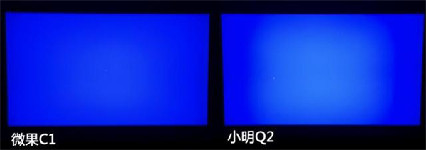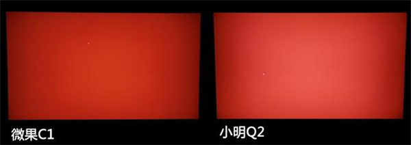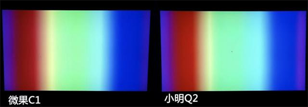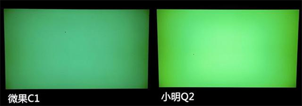 红蓝绿3原色测试,小明Q2比微果C1亮度以及饱和度更高,后者的绿色略微有点偏色,整体效果会发蓝发白,至于暗角问题是入门级投影的通病。