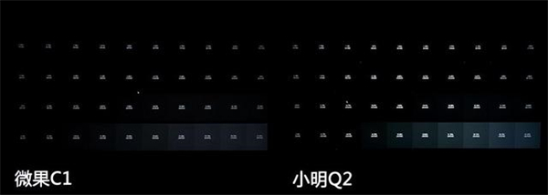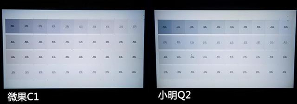 黑白灰阶测试,小明Q2得益于2000:1的对比度优势,明场在第4行依旧隐约可见分界线,暗场可分辨区块比微果C1多出4格,在此级别的投影中表现突出。
