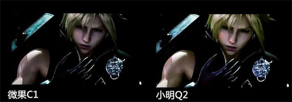 使用《最终幻想7》的游戏视频来考验2款产品的影音播放能力,小明Q2放映出的克劳德面色红润有光泽、头发金黄有质感,更为接近显示器呈现的效果。