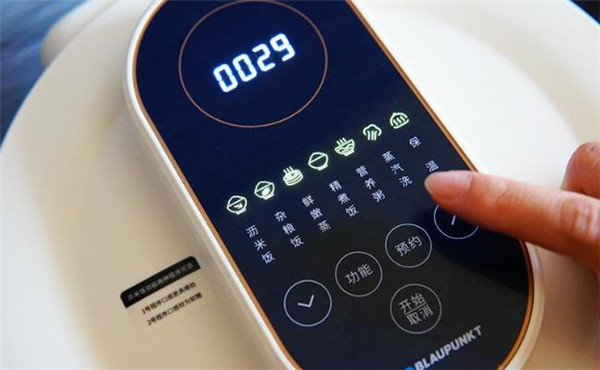 从正面看,蓝宝蒸汽米汤电饭煲最醒目的就是这个圆形按键,周围还有一圈金边进行装饰,颜值非常高。所有的操控按钮都集中在锅盖顶部,最上面是显示区,虽然屏幕是长方形,但用了一个圆形的金圈来勾勒,更显时尚感。下方是模式选择区,共有五种不同的蒸、沥、煮法及蒸汽洗、保温、预约共八大模式选择,而且排列的顺序也是按照日常的使用频率精心设计的,比如沥米饭就放在最前面。最下方为功能按钮、除了用于模式选择的功能键之外,还有时间加减、预约及开始/取消。