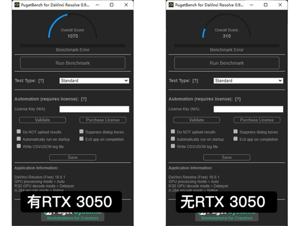 其次是DaVinci Resolve,有RTX3050加速的情况下,惠普战99商用台式机得分1070.而去掉RTX3050之后,得分为310.相比之下,RTX3050带来了约245%的效率提升。