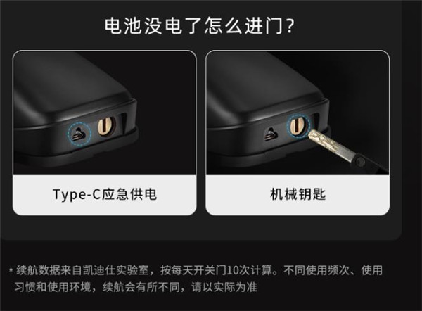 应对特殊情况,诸如智能锁低电量或者电量耗尽,凯迪仕K20 Pro Max也是支持使用应急机械钥匙开门,在智能锁底部留有钥匙插孔可使用附送的实体钥匙直接开门,锁孔比较隐蔽,虽然开门略显费劲,但隐蔽性好也避免了不必要的破坏。当然在没电时,也可使用充电宝为锁供电开门使用,Type-C的接口,连上即可应急供电。