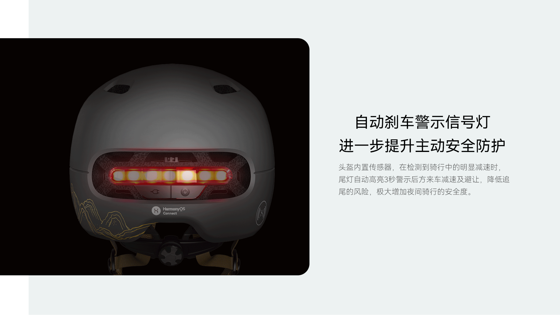 头盔的智能光感装置,使得尾灯可以根据环境光线强弱自动调节亮度;头盔还拥有自动刹车警示灯,当传感器检测到用户减速后尾灯自动高亮,降低追尾风险,大大提高骑行的安全性。