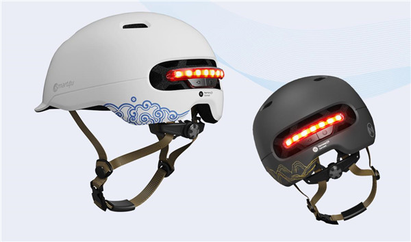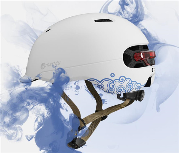 Smart4u城市通勤智能闪盔SH50,支持鸿蒙智联一碰连,带有智能灯光和摔倒报警功能,以及清华·力合云记独家授权的自消杀抗菌除臭的新材料内衬。不仅如此,头盔的涂装将中国文化融入其中,充分展现东方特色。