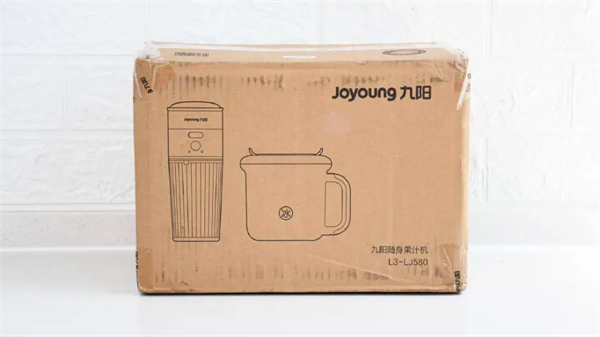包装采用传统的牛皮纸箱子,正面印有果汁机和两个杯子的线条轮廓图,右上角标注有九阳的LOGO。