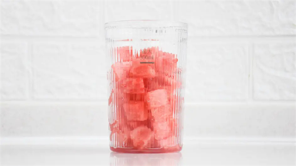 日常用到最多的就是榨果汁,尤其是夏天各种新鲜水果都很丰富,这次就以榨西瓜汁做个演示。先把西瓜切成小块倒入榨汁杯中,杯子的容量是300ml,放水果的时候要注意不要超过刻度线。榨汁杯采用进口Tritan材质,不含双酚A,可以放心使用。