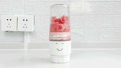 然后将榨汁杯翻过来,主机在下杯子在上,长按正面按键2秒解除童锁,再次双击按键开始榨汁。稍等片刻就可以看到杯子里的果肉变成果汁,虽然只有两个叶片的小刀头,但榨汁的时候转速可以达到15000转/分,榨汁效率杠杠滴。
