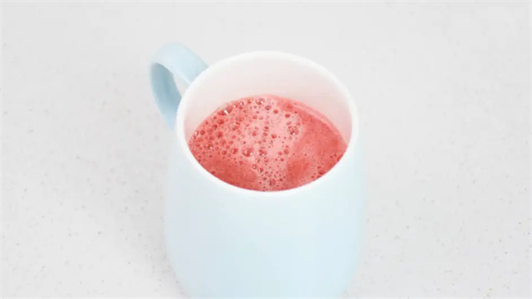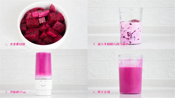 和做西瓜汁一样,先把火龙果切成小块,取大半火龙果块和牛奶混合导入榨汁杯中,利用榨汁功能将其榨成混合果汁。从冰箱中取出冷冻后的冰桶,冰桶外壁温度较低,直接接触容易冻伤手指,抓着把手拿出来就好。