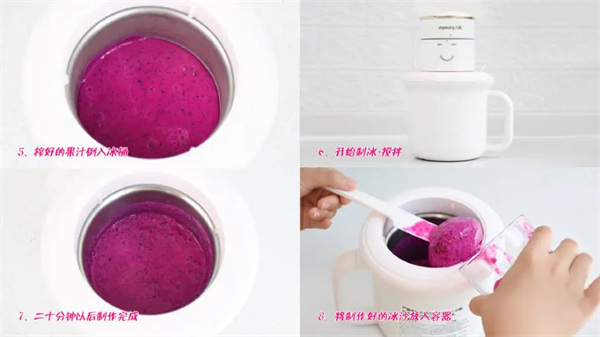 将榨好的果汁倒入冰桶,最大容量为300ml,并依次安装好搅拌杆和防尘盖,并将主机另一端扣到冰桶上,要让搅拌杆尾端插入到主机底部的安装孔中。开机会自动检测到搭配冰桶,在冰激凌模式下开启制冷和搅拌,大约需要20分钟左右。