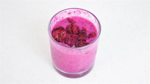 完成以后将主机取下,揭开防尘盖并取出搅拌杆,冰沙就做好了。找一个容易把倒出来,再将之前预留的少量火龙果块放在上面加以点缀。自己做由于食材有限,加之是第一次尝试,卖相貌似不是很理想,不过口感却很不错,毕竟是原汁原味的水果和牛奶,没有其他食品添加剂,很健康。