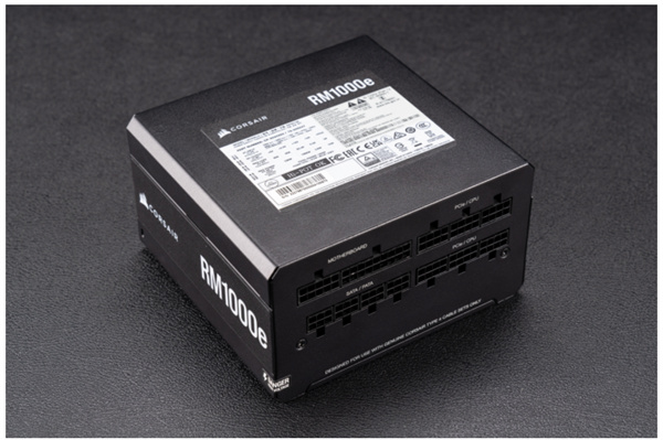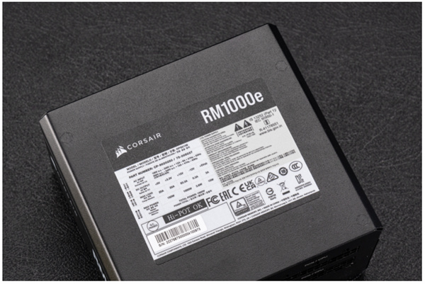 RM1000e电源采用了常规的纯黑涂装,经典的八边形外观延续了RMx系列的设计,侧面以及顶部的出风口格栅都为海盗船家族式的三角造型,整体的外观简洁硬朗。特别值得一提的是,RM1000e的船型开关非常宽大,且为左右拨动方式,不需要用力点按即可触发,很适合我们经常需要开关电源的测试平台使用,玩家日常使用也更方便。