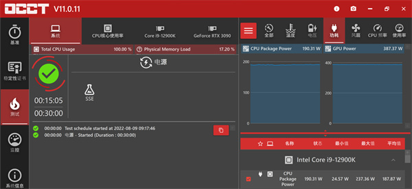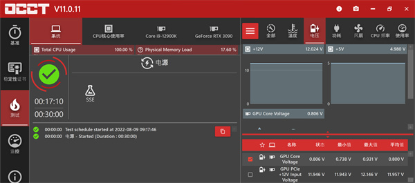 测试环节,我们选择了Intel酷睿i9 12900K+RTX3090搭建的高端测试平台,RM1000e的双8-pin EPS12V和多个PCIe接头在兼容性上非常不错,能够支持旗舰级的主板和显卡。接下来,我们开启OCCT电源考机模式,从软件的记录数据来看,CPU满载功率达到了190.31W,显卡功率达到了387.37W,考虑到其他硬件的供电需求,平台的整体功耗在600W以上,不过这对于额定功率1000W的RM1000e来说只有60%的负载,在这个负载状态下,电源的转换效率依然在90%以上。
