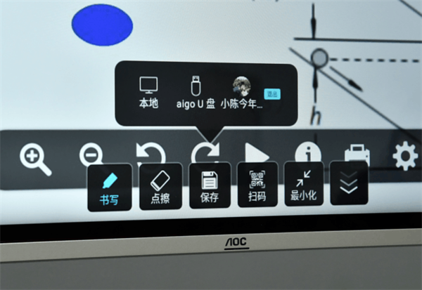 至于功能方面,利用马克笔的功能,可以实现笔记粗细的选择,同时擦除功能具有点擦和全屏擦除的功能。用户还可以使用双色笔迹的功能,设置两种原色,利用触控笔的两头可以实现双色输出。此外AOC T13F会议平板 还配置了投屏功能以及倒计时的功能,在开会的过程中可以快速统计投屏,同时计算时间。
