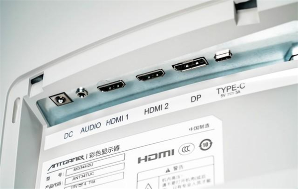 接口方面,蚂蚁电竞 ANT34TUC采用了两个HDMI 2.0、一个DP 1.2、一个Type-C以及音频输出的标准接口配置。其中,Type-C接口在连接手机等移动设备时,可以为设备提供高达15W的反向供电,具有不错的实用性。