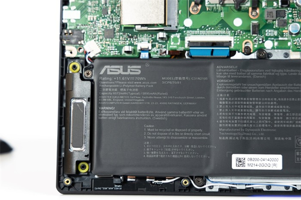 可以看出华硕不想为了高性能而牺牲该机的续航,因此华硕为该机配备了70Wh大容量电池。那么该机整机重量就要相对低压U的机型要更重一些——这款机子重量也来到了1.4kg左右。