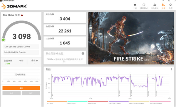 配备有80EU的锐炬Xe显卡,通过3DMark FireStrike的实际测试来看,3404分的显卡分能够满足日常的轻度视频剪辑和图片处理等需求。